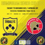 Tividale will face League 2 side Walsall FC in the 2nd Round of the Birmingham Senior Cup. The game will take place on Tuesday 7th November 2023.